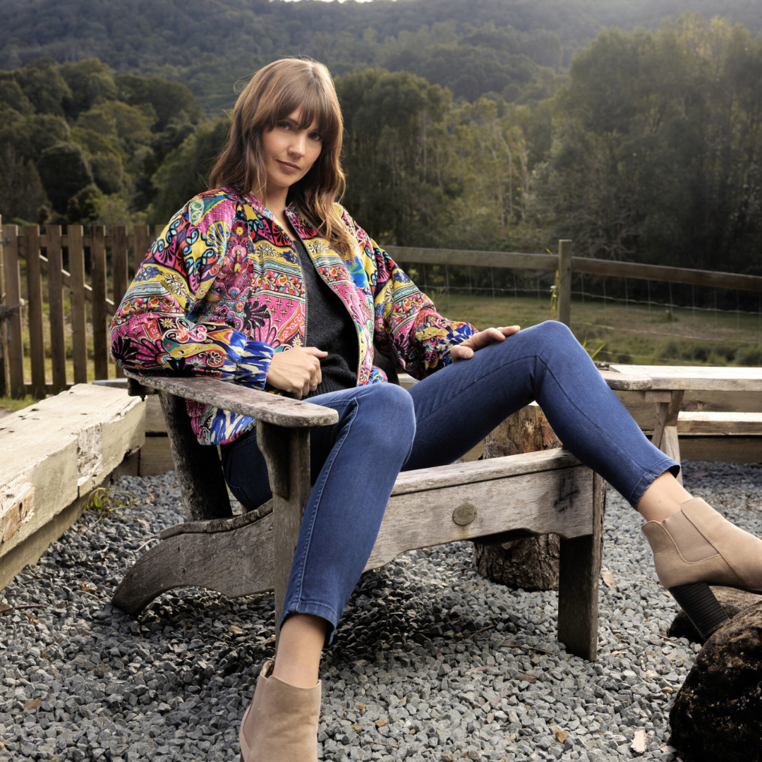 Elevate your look with this short-length bomber jacket, crafted from soft polyester velvet for a rich texture and lightweight feel. Featuring a full-zip front with a concealed button placket, it offers a streamlined and polished finish. The round collar and long sleeves with gathered cuffs create a classic bomber silhouette, while the vibrant prints bring a bold and stylish touch. Perfect for layering in transitional seasons, this versatile jacket combines casual comfort with statement-making design.