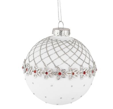 GLASS BAUBLE - WHITE SILVER RED FLOWER | Christmas